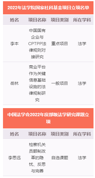近日获悉,公司在2022年度国家社科基金项目立项和中国法学会2022年度部级法学研究课题立项中喜获佳绩,共有3个项目获得立项,获批重点项目1项、一般项目1项以及自选课题1项。本年度全校国家社科基金项目立项31项,公司在国家社科重点项目上实现突破,人均产出较高,多项国家级课题项目的立项进一步提升教师尤其是青年教师的科研积极性,为公司营造了更为浓厚的科研氛围,推动了公司科研水平不断提升。