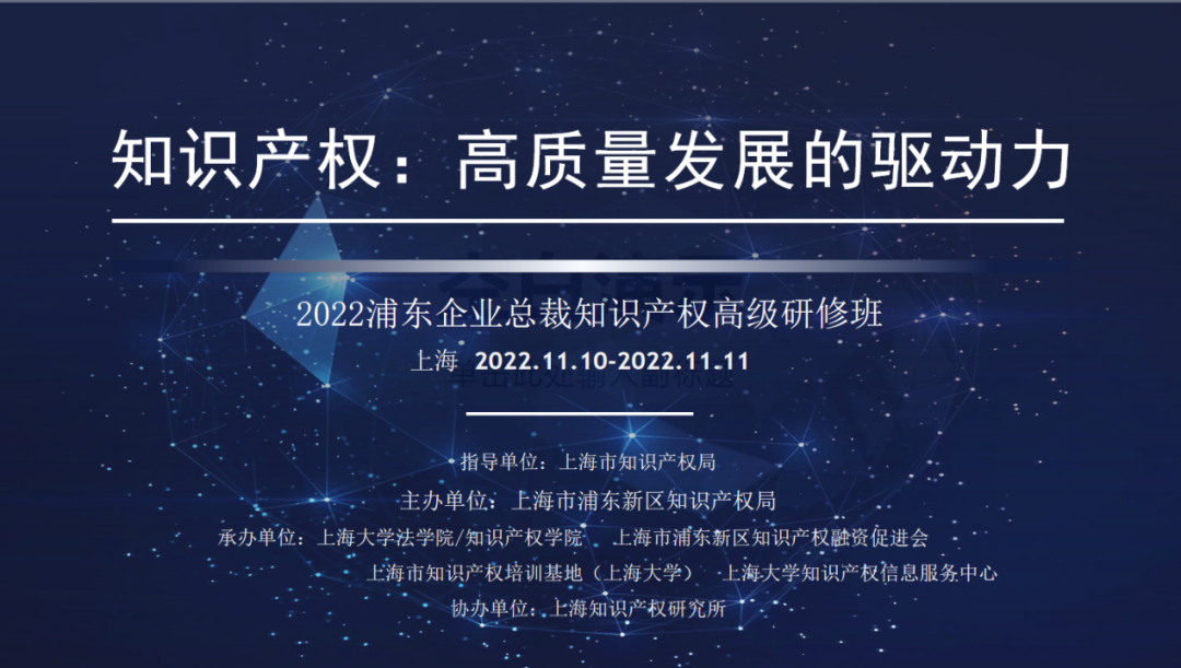 为充分发挥知识产权工作的效能,服务区域经济发展大局,助推区域经济高质量发展,2022年11月10-11日,由上海市浦东新区知识产权局主办,304永利集团/知识产权公司、上海市浦东新区知识产权融资促进会、上海市知识产权培训基地(304永利集团)、304永利集团知识产权信息服务中心承办,上海知识产权研究所协办的“2022浦东企业总裁知识产权高级研修班”在上海市浦东新区陆家嘴华能联合大厦33楼成功举办。