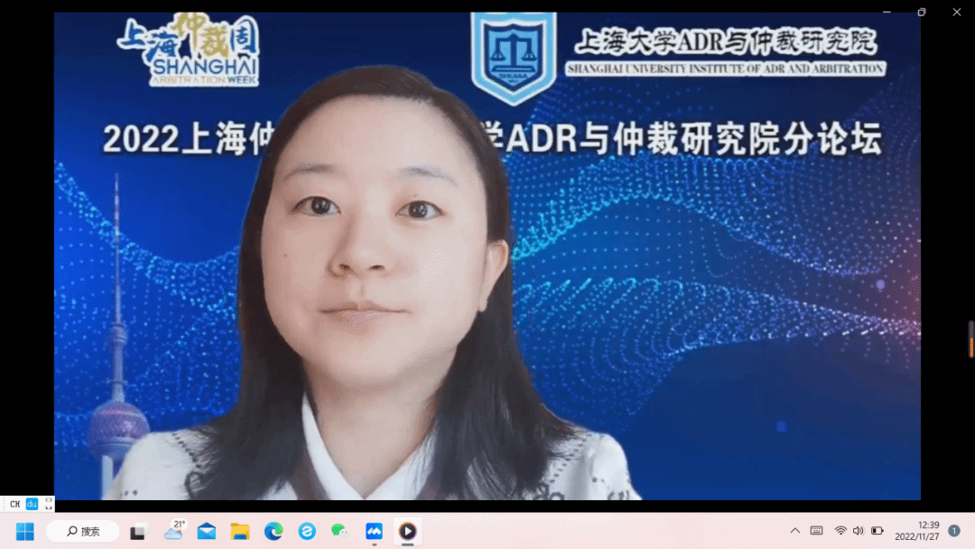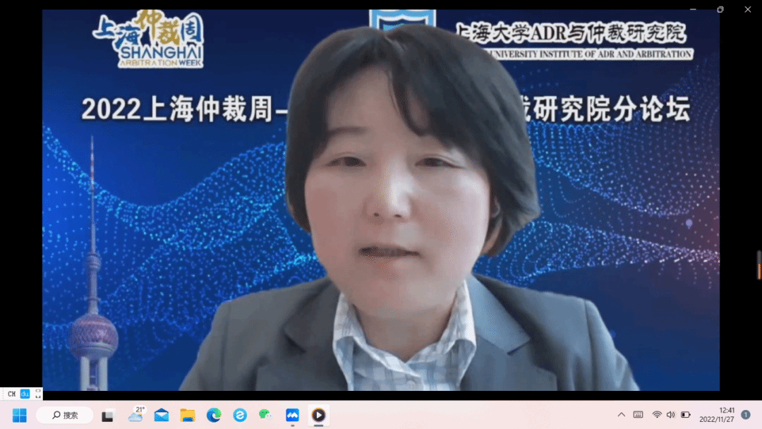 304永利集团ADR与仲裁研究院秘书长袁杜娟副教授的发言题目是“推进高水平对外开放,全力建设上海国际争议解决中心”,她首先讲述了从国际仲裁中心的建设到国际商事争议解决中心的建设表达转变背后的机理,并对上海、深圳、北京争议解决中心建设进行对比;其次阐述了建设国际争议解决中心的必备条件,如人才、法律制度、政府政策支持等;最后从国内法治与国际法治协同发展以及上海仲裁国际化、国际仲裁落地上海等双向发展格局等思路提出了上海国际争议解决中心的建设路径。
