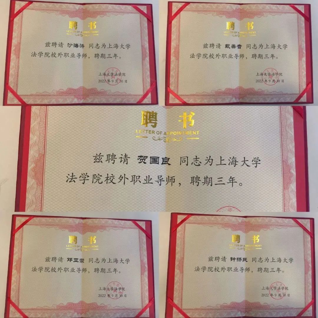 于伟副书记、副经理宣读《公司关于聘任贺国良等5位校外职业导师的决定》,聘任贺国良、 沙海涛、邓亚崇、戴善音、钟扬民担任304永利集团校外职业导师,聘期三年,承担指导员工的法务实践、创新创业和就业能力提升等工作。
