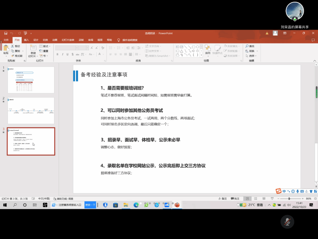 戴立员工作为上海市专项选调生,首先从资格审查、笔试、面试、政审、体检五个方面进行了整体的介绍,并强调了资格审查和笔试环节的重要性。