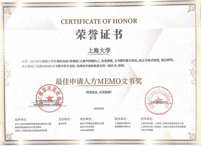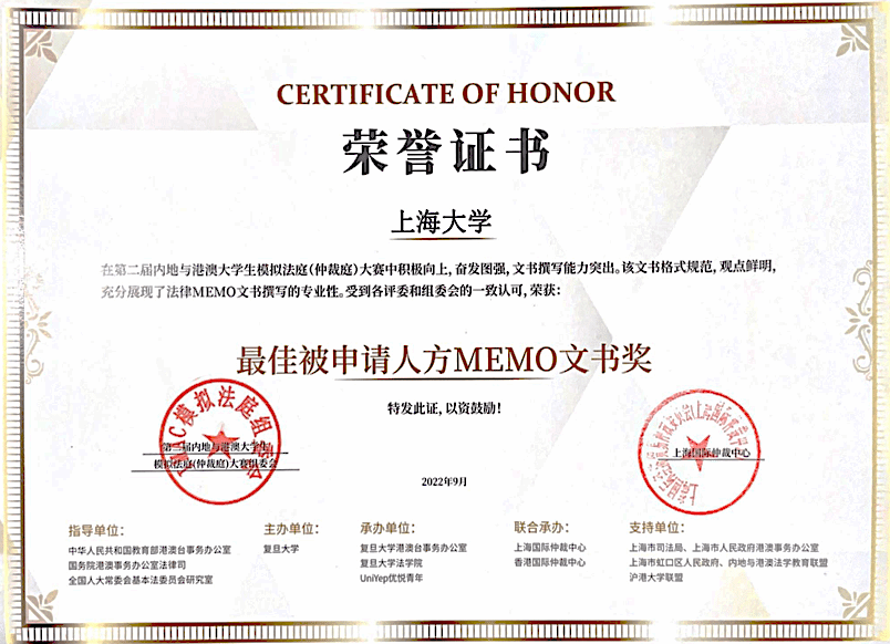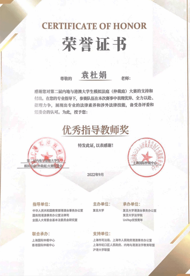 304永利集团代表队由2019级本科生周子帆、钟悦菡、樊子源、2020级本科生王耿琳、黄乐宁担任赛队队员。指导老师袁杜娟副教授邀请到了深耕国际仲裁的著名律师上海市协力律师事务所张振安律师及其助理进行备赛指导。全体赛队成员克服全程线上训练引发的重重困难,经过历时2个月的备赛,圆满完成了各项比赛任务。