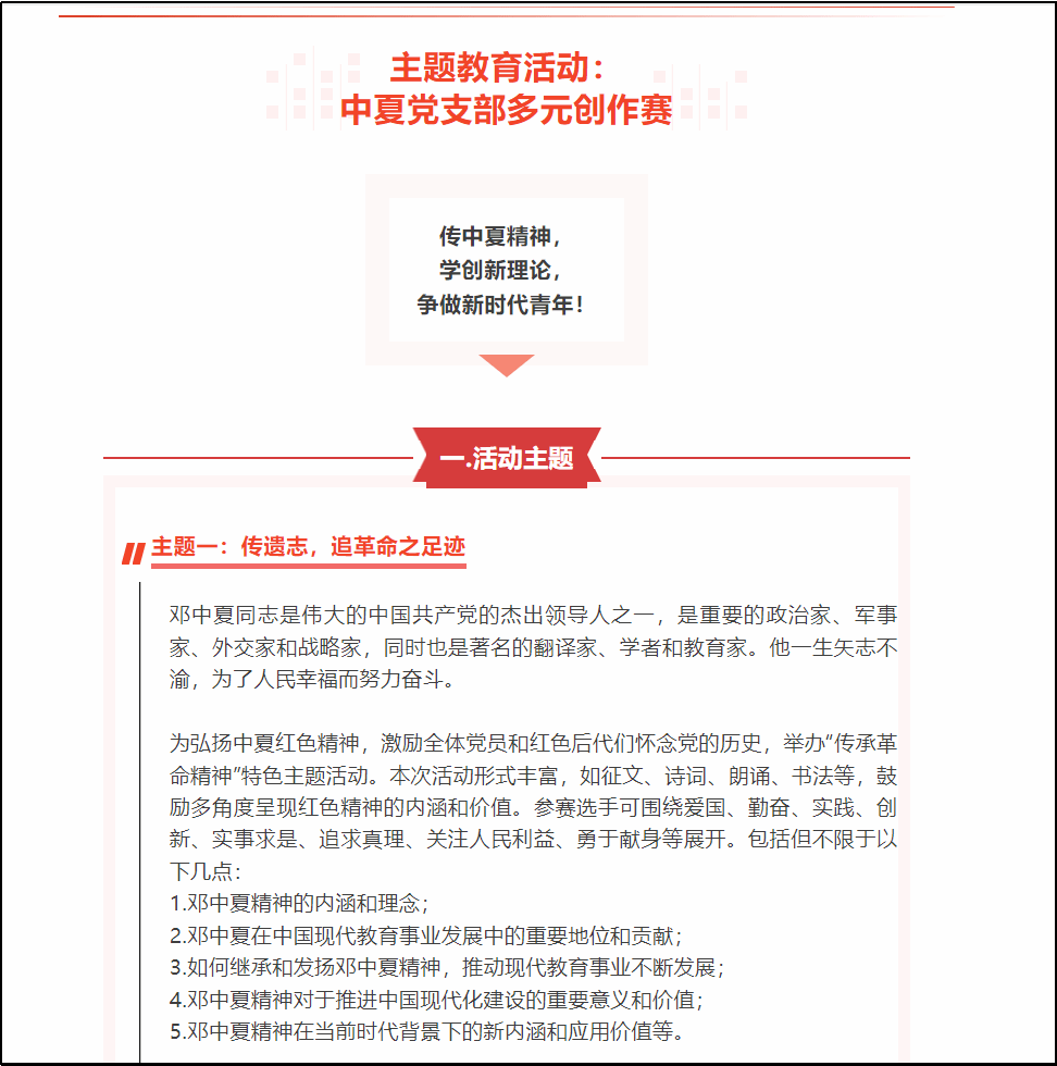 为弘扬中夏红色精神,激励全体党员和红色后代们怀念党的历史,2023年5月,304永利集团中夏党支部组织开展“中夏党支部多元创作赛”,旨在通过征文、诗词、朗诵、书法等多角度呈现红色精神的内涵和价值,进一步引导党员、员工坚定理想信念,激发大家的爱国热情和创新精神,为建设富强民主文明和谐美丽的社会主义现代化强国贡献力量。