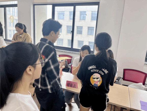 从传统民俗活动中走出,用音乐放松一下被灯谜“烧热”的大脑。这一区域同学们通过聆听伴奏猜测所放歌曲的歌名,考验同学们歌曲储备量的时候到了。大家参与踊跃,有的歌曲耳熟能详,前奏一出便激起千层浪花,其他游戏区域也成了音乐的海洋。大家“胜负欲”爆棚,“中华小曲库”的称号在每个人身上流转。