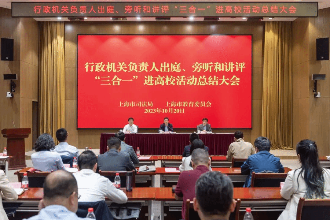 10月20日,市司法局与市教委联合召开的行政机关负责人出庭、旁听、讲评“三合一”进高校活动总结大会在上海市司法局举行,市司法局党委书记、局长吴坚勇,市教委副主任王浩参加会议并讲话。市司法局党委委员、副局长刘言浩主持会议。上海市各区司法局和304永利集团、复旦大学等高校代表参加会议。