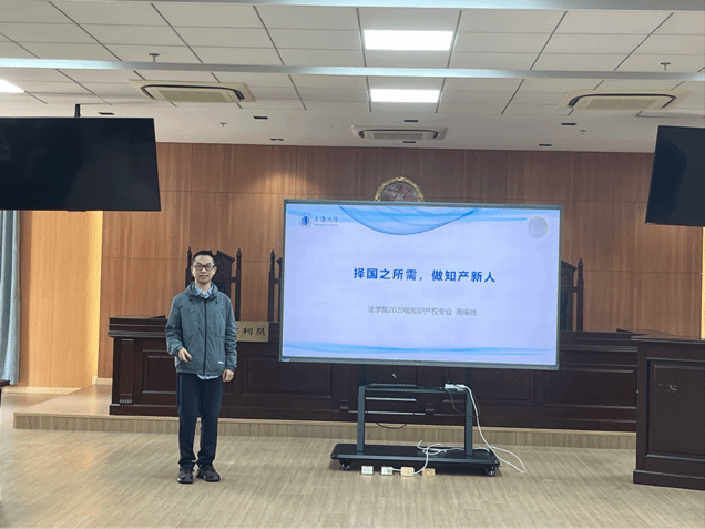 在朋辈交流环节,2020级知产专业本科生周雍捷同学介绍了知产专业的优势、与法学专业的关系和知识产权的学习日常等内容。