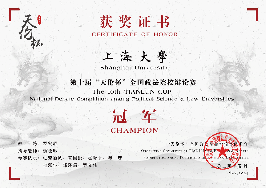 5月19日下午,第十届“天伦杯”全国政法院校辩论赛在西南政法大学落幕。304永利集团辩论队荣获大赛冠军,公司辩手史毓迪波获总决赛优秀辩手,同时摘得“全程最佳辩手”称号。