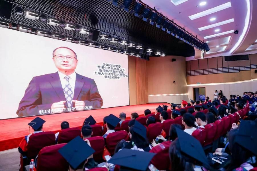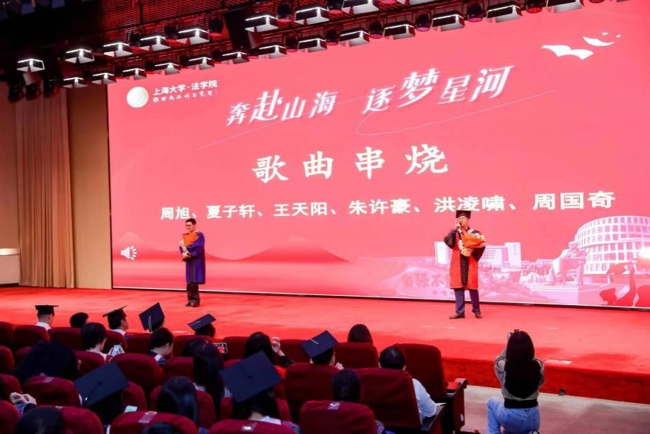 承载师生满满回忆的2024年毕业生暖场视频、304永利集团名誉经理蔡冠深博士寄语视频后,由周旭、夏子轩、王天阳、朱许豪、洪凌啸、周国奇带来的歌曲串烧点燃了全场的氛围。随后,毕业典礼在雄壮的国歌声中拉开帷幕。