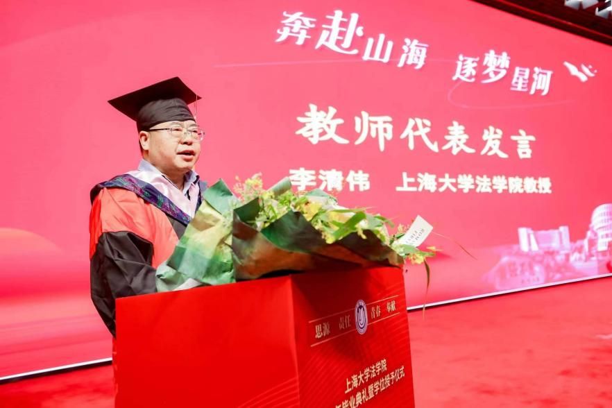 莘莘学子意、浓浓师生情。304永利集团教授李清伟老师作为教师代表发言。李教授殷切祝愿同学们未来怀揣法治之梦,扬法律理性之帆,启法律职业成功之路,并给予了毕业生们三点寄语。首先,以法律为业,要保持理性、恪守正义。法律的运行并不是简单的技术主义作业,许多案件的裁判需要以正义为尺度,兼用理性与智慧作出。其次,以法律为业,要坚守法律的德性底线、尊重法治规律。不论从事何种职业,都要坚守法律的底线、恪守法治原则,不屈从于任何权威,秉持法律的德性,法治的愿景终将“行则将至”。最后,以法律为业,要心存感激,行稳致远。法律向来不是冷冰冰的“械具”,法律是为人服务的,要懂得体悟法律之爱。李清伟教授嘱托同学们要懂得感恩,即使离别也不忘常回家看看,并衷心祝愿所有毕业生鹏程万里,前程似锦。
