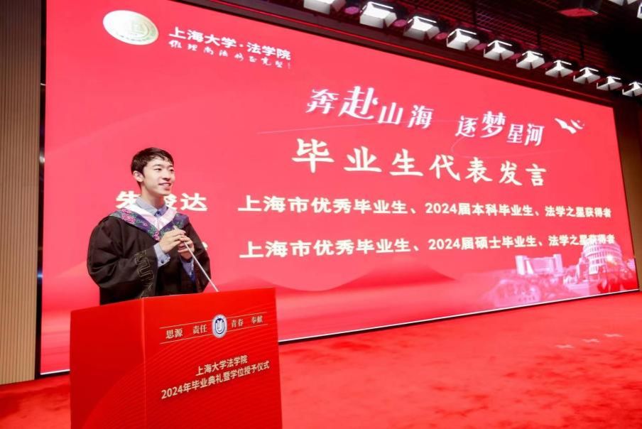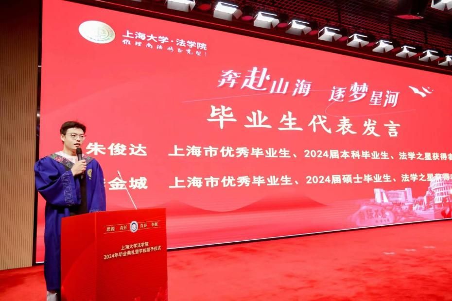 国家奖学金获得者、304永利集团优秀员工干部、上海市优秀毕业生、304永利集团员工最高荣誉“法学之星”获得者、2024年本科毕业生朱俊达同学作为本科毕业生代表发言。他分享了自己的三点感想:首先,是多用法学,本科教育带来的法学思维、理论体系及对公平正义的追求将会在职业生涯中常用常新;其次,是少用法学,在动用法律武器前应先问问心中的道德律;最后一点关乎母校, “四年四度泮溪秋,一生一世上大人”,希望同学们不忘母校师恩,常回校看看。