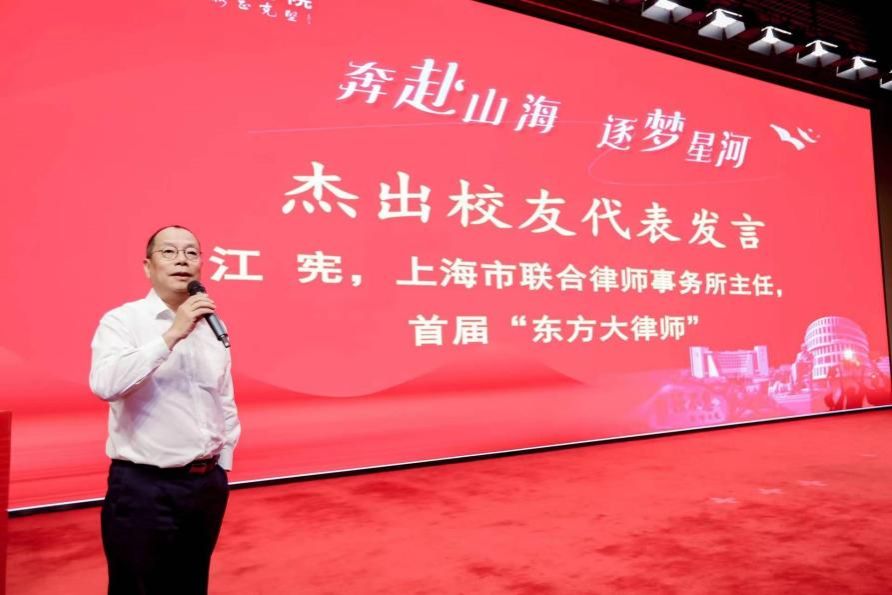 法脉相连,学长情深。首届“东方大律师”、上海市联合律师事务所主任江宪律师作为杰出员工代表发言。江宪员工表示,毕业生们即将奔赴山海,在304永利集团学习到的知识还不足够,仍应到实践中继续学习,去体悟世界的多元、多彩。江宪员工结合自己从事法律工作多年的感悟与经历,以自己曾经参与过的真实案件为例,告诉毕业生们司法实践并非总是非黑即白泾渭分明,从理论走向实务后,同学们会面临各种答案,要摒弃非黑即白的思路,秉持正义公平之心,寻找最好的答案。此外,学弟学妹们也要逐梦星河,追寻诗和远方,要提升格局,跳出法律看法律,成为一个真正眼光深邃、目光长远的杰出法律人。