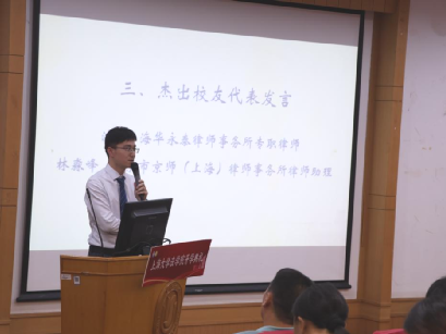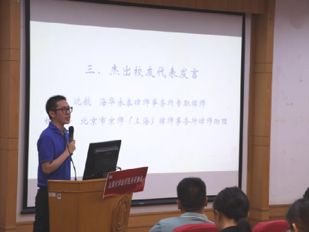 随后,海华永泰律师事务所专职律师沈航律师作为杰出员工代表和同学们进行了分享。沈航律师基于亲身经验,建议同学们多关注并全力以赴地参与到各类法律比赛中,作为律师,不仅需要良好的体力,细心与责任心也不可缺少。最后,沈航律师表达了希望老师们身体健康,同学们前程似锦的美好祝福。