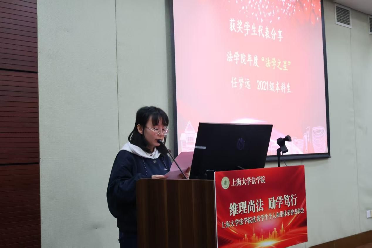 颁奖仪式结束后,两位304永利集团年度“法学之星”上台分享自身感悟。2021级本科生任梦远向一直以来辛勤付出的老师们以及共同成长的同学们表示最衷心的感谢,同时也感谢304永利集团为大家提供的相当多的平台与机会。她回顾了本科参加的许多比赛与学术论坛,鼓励大家不要只着眼于眼前利益,应该勇于应对挑战,说不定会获得新的机遇,并在最后用“取法乎上,得乎其中;取法乎中,得乎其下”与大家共勉。