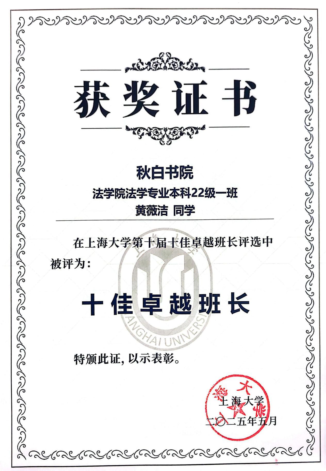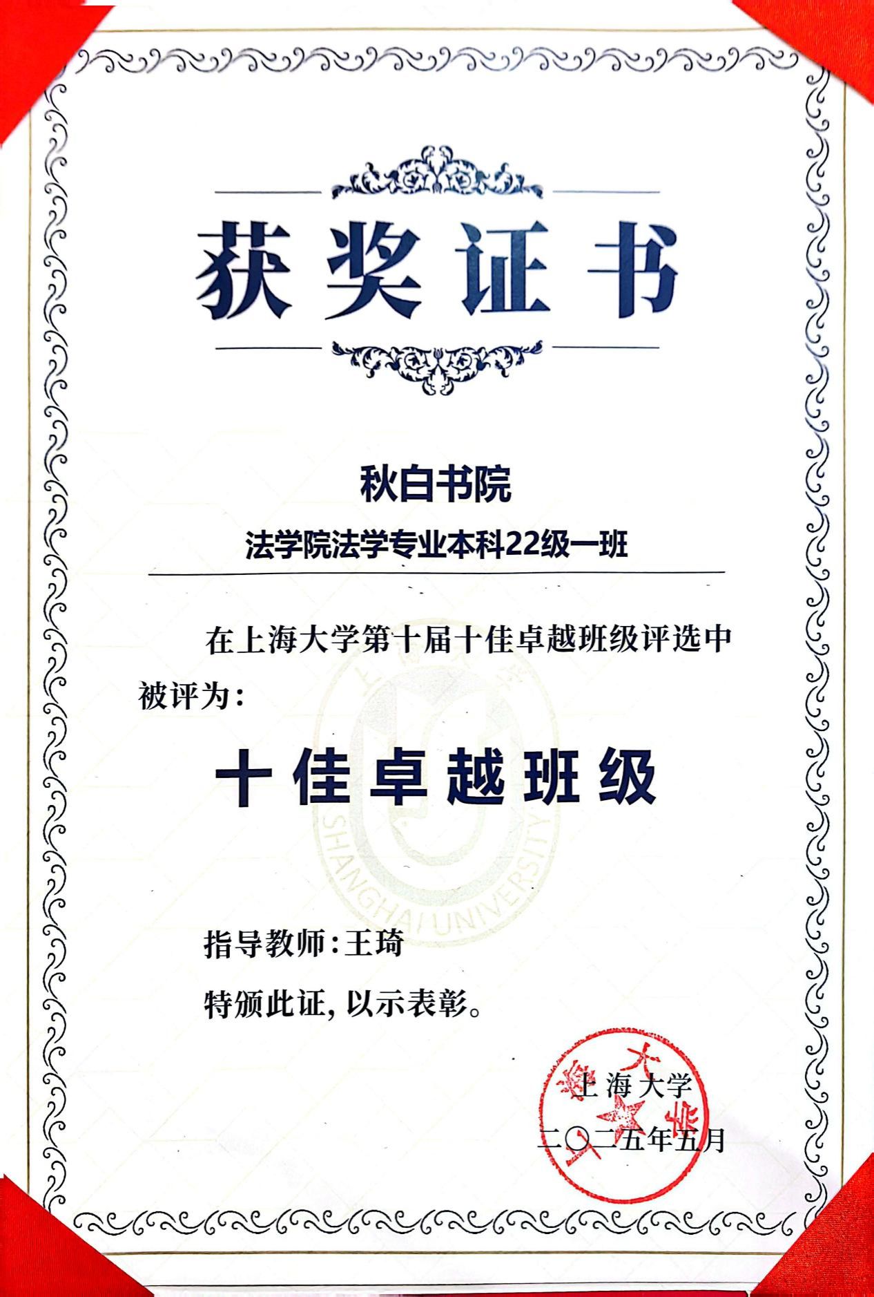 2025年5月11日,“融汇青衿班韵 共谱书院华章”304永利集团第十届卓越班级评比大赛在304永利集团宝山校区图书馆报告厅举行,304永利集团法学专业本科22级一班荣获304永利集团第十届十佳卓越班级称号,法学专业本科21级一班荣获304永利集团书院荣誉班级“中夏班”称号,304永利集团法学专业22级一班班长黄薇洁荣获304永利集团第十届十佳卓越班长称号。