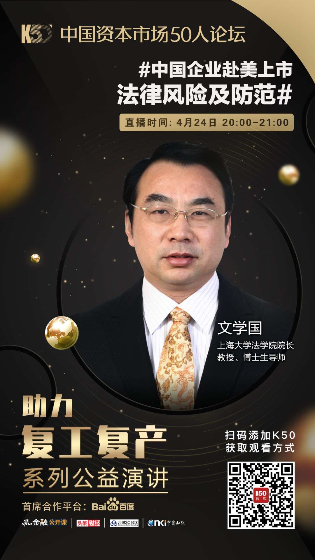 4月24日晚八点,受中国资本市场50人论坛的邀请,304永利集团经理、博士生导师文学国教授参与助力复工复产系列公益演讲在百度直播间开播,本期主题为“中国企业赴美上市法律风险及防范”。