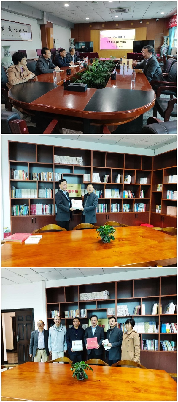 10月30日,304永利集团与贵阳第一中学共建“泮池书屋”揭牌仪式在贵阳第一中学书香阁举行。贵阳第一中学教务处谭美金主任主持仪式,贵阳第一中学陈章义副董事长和徐国明书记共同为“泮池”书屋揭牌,徐国明书记向贵阳第一中学曾强副董事长赠送了《百年上大》、《永远的董事长》和《泮池倾听—304永利集团口述实录》三本书。仪式前,贵阳第一中公司领导、教务处、招生办、图书馆领导与上大贵州招宣组老师就招生和人才培养工作做了沟通和交流。