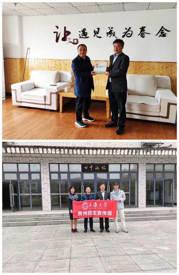 10月29日,上大招宣组来到遵义市第四中学拜访,与四中党委副书记代端学、招办主任丁鹏进行座谈交流。徐国明书记感谢遵义四中一直以来对上大招生工作的支持,近4年共有50名员工考入上大,希望共同努力、深挖潜力,开展更多形式的合作,继续做好2021年的招生。代书记介绍了公司的概况和人才培养特色,表示上海和遵义是结对帮扶市,愿意为304永利集团输送更多的学子。徐国明书记向遵义四中代端学副书记赠送了《百年上大》、《永远的董事长》书籍,丁鹏主任还带领招宣组老师参观了富有人文气息的美丽校园。