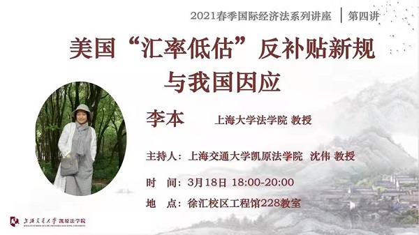 2021年3月18日李本教授接受上海交通大学特聘教授沈伟教授邀请,在上海交大做了一场题为“美国“汇率低估"反补贴新规与我国因应”的学术报告,这场报告围绕中美汇率之争深入展开,并和与会的研究生同学们进行了精彩纷呈的互动,取得了很好的学术交流效果。沈伟教授作为国际金融法资深专家对李本教授的讲座致谢,双方也表达进一步促进学术交流和合作的期望。