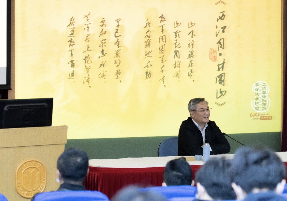 刘贤军副市长以他对上大的了解和对青春的向往作为开场白,深刻阐释了“学史明理、学史增信、学史崇德、学史力行”的深层内涵,通过援引习近平总书记的重要讲话深入论述了学习党史的重要性,明确只有学好党史才能“明方向,知未来”。刘贤军以毛泽东诗词文章心路历程为路径和切入点,从共产党成立、大革命时期和大革命失败、土地革命和国内革命战争时期、抗日战争时期、解放战争和新中国成立5个板块,详细讲述了从中国共产党成立前后到新中国成立前后的重要历史事件和历史人物,勾勒出了一幅中国共产党气势磅礴、波澜壮阔的诞生发展的历史画卷。