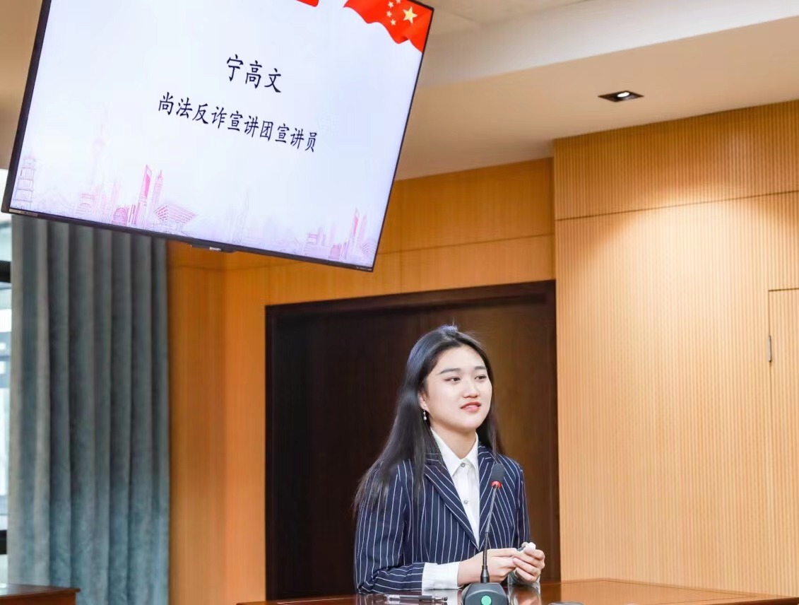 宁高文同学从知名普法栏目主持人接到诈骗电话案例引入,对诈骗、新型手段实施诈骗犯罪的主要类型进行分析,结合现实案例,提出具体的防范措施,形式活泼,语言生动,现场气氛热烈。