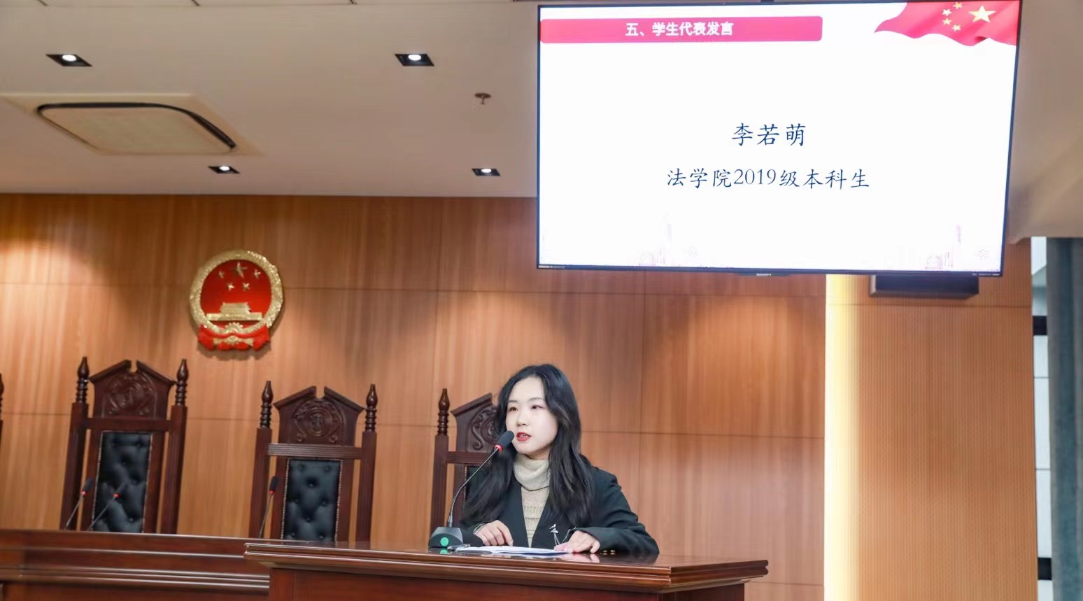员工代表李若萌在闭幕式上发表感言,作为法科员工,因为懂得法律而变得理性和审慎,因为懂法更要不失温度和温情。在法治文化节中,通过各种锻炼和实践,同学们不但收获了实践能力的提升,更进一步厚植了法治理念和家国情怀。