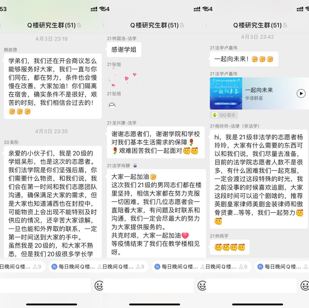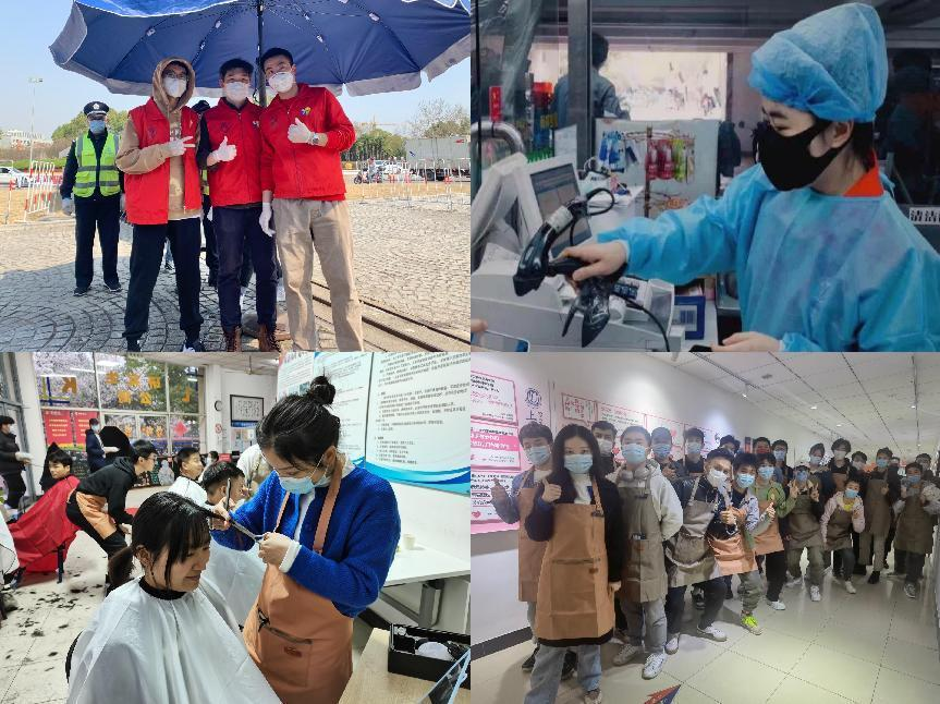 除这几位志愿者以外,乐乎楼、超市收银处、秩序维护处、物资维护处、理发处等到处都能看到公司志愿者同志的身影。他们或许是在南门站一班岗,或者是参与一次核酸检测,在下课后去教超帮忙,又或者是加入“tony天团”为师生理发......疫情面前,他们逆行而上,奋勇担当。
