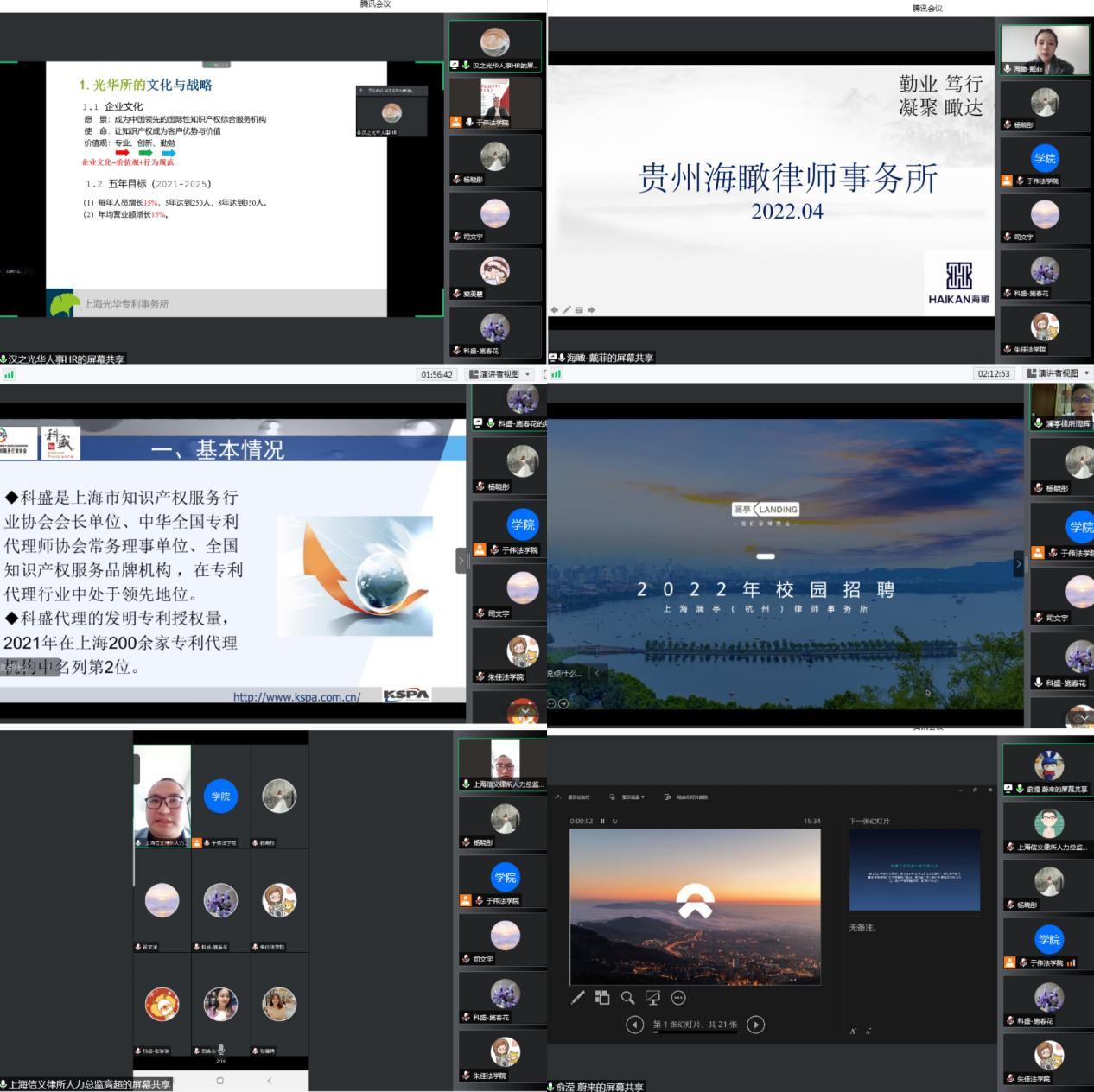 上海光华专利事务所、贵州海瞰律师事务所、上海科盛知识产权代理有限公司、上海澜亭(杭州)律师事务所、上海市信义律师事务所、上海蔚来汽车有限公司等优质单位提供了包括商标代理人助理、知识产权管理销售、专利事务律师、数据合规法律顾问、实习律师、律师助理等31个工作岗位。招聘宣讲人员主要从单位概况、招聘岗位、人才培养计划、福利补贴等方面进行宣讲介绍。通过对核心业务板块、竞争优势、岗位特性、业务特点、人才培养机制、办公环境等方面的介绍,同学们初步了解到关于我们与企业文化。各用人单位都特别介绍了本单位的人才培养计划,还就毕业生关心的薪资福利等问题进行了讲解。