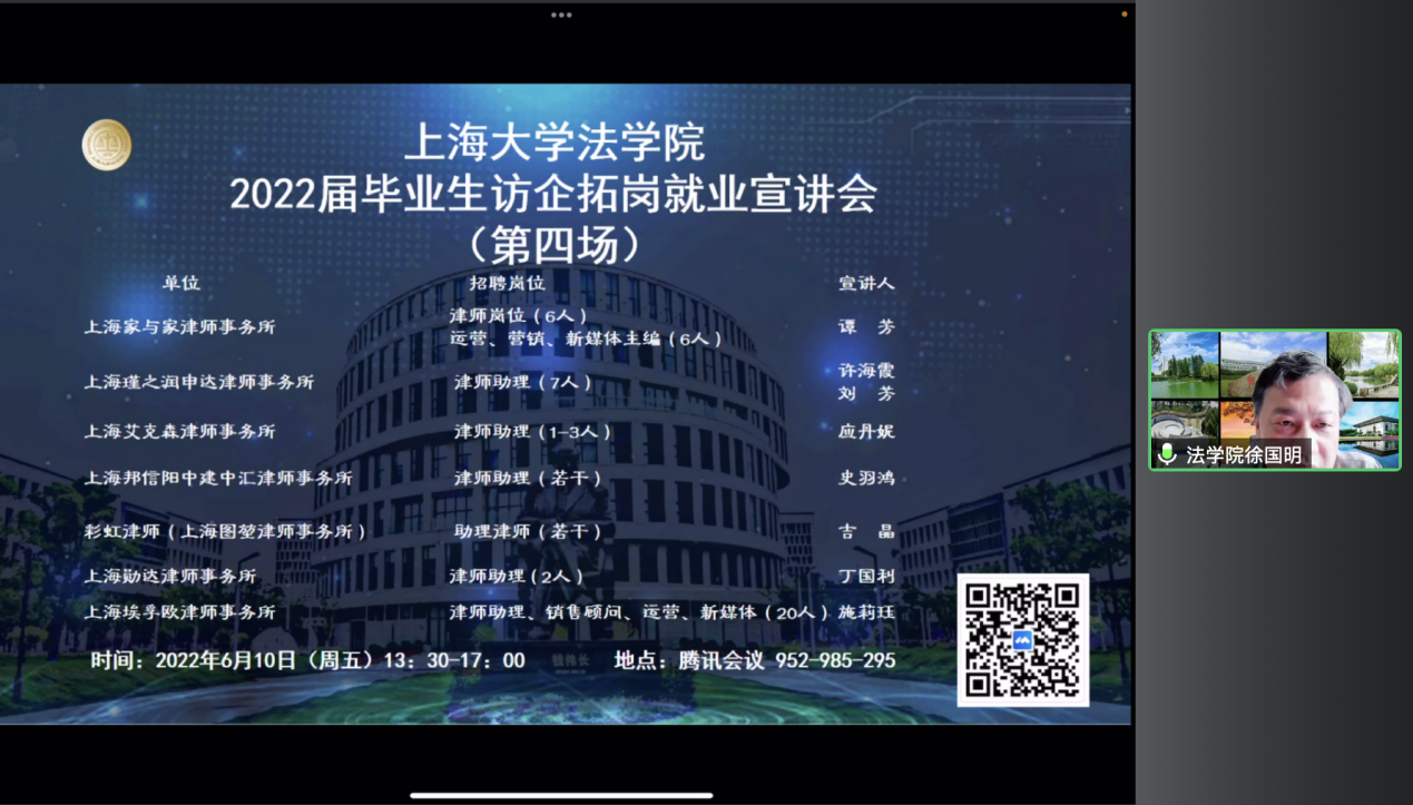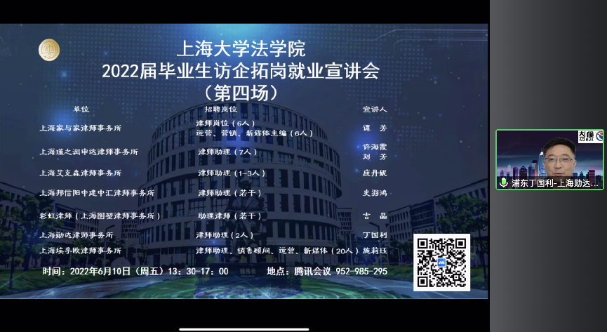 上海勋达律师事务所主任丁国利员工介绍了律所的发展历史。该所名称寓意“功勋卓著,达济天下”,并以“团结、友爱、互助、共享”为企业文化。丁国利员工还分别介绍了律所的办公环境、律师的成长、招聘岗位、招聘要求等相关内容,诚挚邀请学弟学妹们加盟。