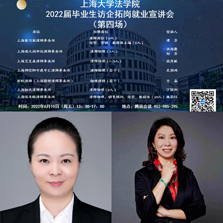 上海瑾之润申达律师事务所主任、全国优秀律师许海霞律师介绍了律所的发展历史。上海瑾之润申达律师事务所曾获全国优秀律师事务所荣誉称号,并在上海、云南、甘肃等四地定期持续举行公益活动等方式履行社会责任,律所具有独特的合规文化。律所副主任、全国涉外律师领军人才刘芳律师介绍了律所招聘岗位、招聘要求、发展平台和福利体系等内容。