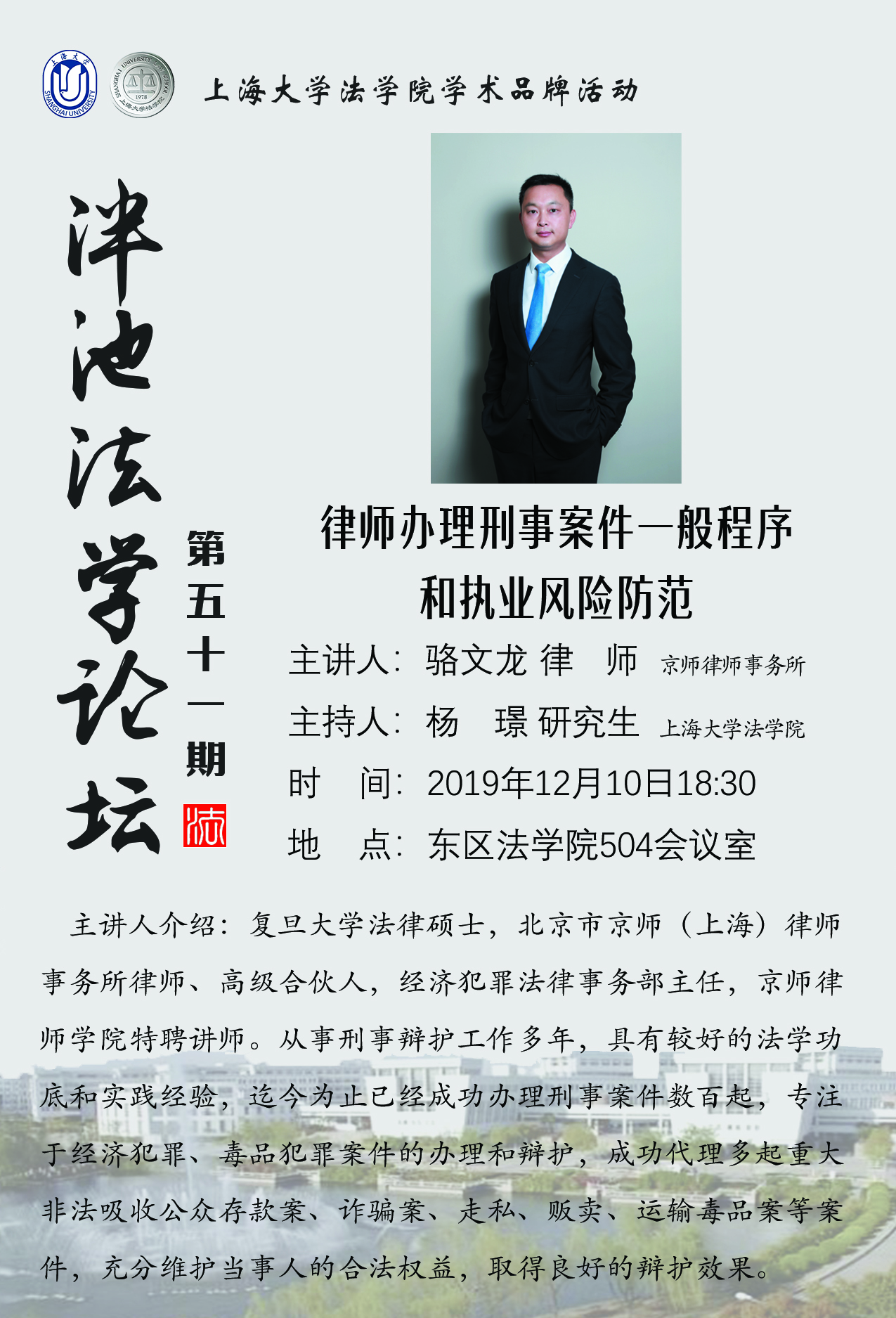 泮池法学论坛第51期预告:律师办理刑事案件一般程序和执业风险防范