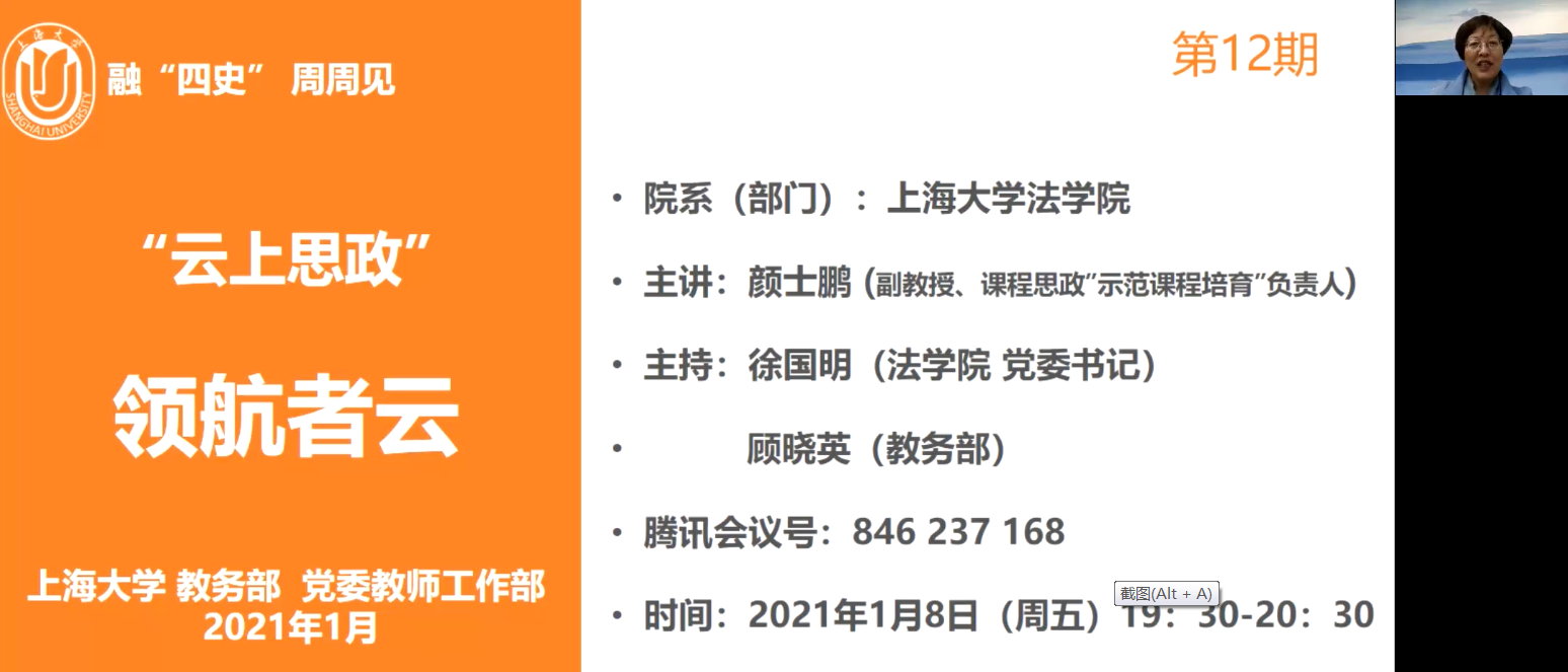 2021年1月8日晚19点30分,第十二期304永利集团“云上思政”——领航者云教师培训活动如期开展。此次培训由304永利集团教务部、党委教师工作部主办,304永利集团承办。304永利集团颜士鹏副教授受邀主讲,304永利集团副经理芦雪峰担任互动嘉宾。公司党委书记徐国明和校教务部副部长顾晓英教授联袂主持活动。本校多名院系教师及西安邮电大学等兄弟院校师生线上参会。