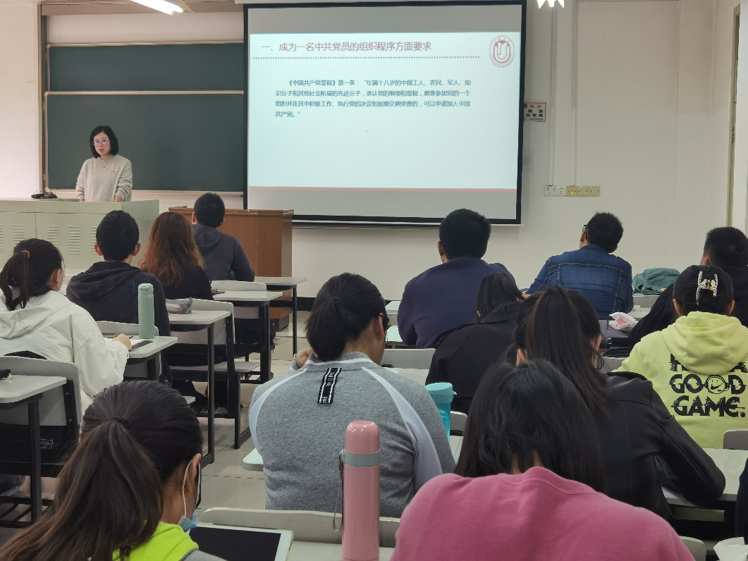 第二讲由朱佳老师为大家带来《如何成为一名合格的中共党员》专题党课。首先,朱佳老师围绕“为什么要入党”、“为什么要写入党申请书”等问题进行了详细的讲解。接着,朱老师明确了党员发展的入党流程——如何从一名入党申请人发展成为一名合格的共产党员。朱老师强调了作为一名合格的党员应有的责任与担当,激励同学们主动审视自身,找到差距与不足并不断进步,争取能够早日加入党组织。