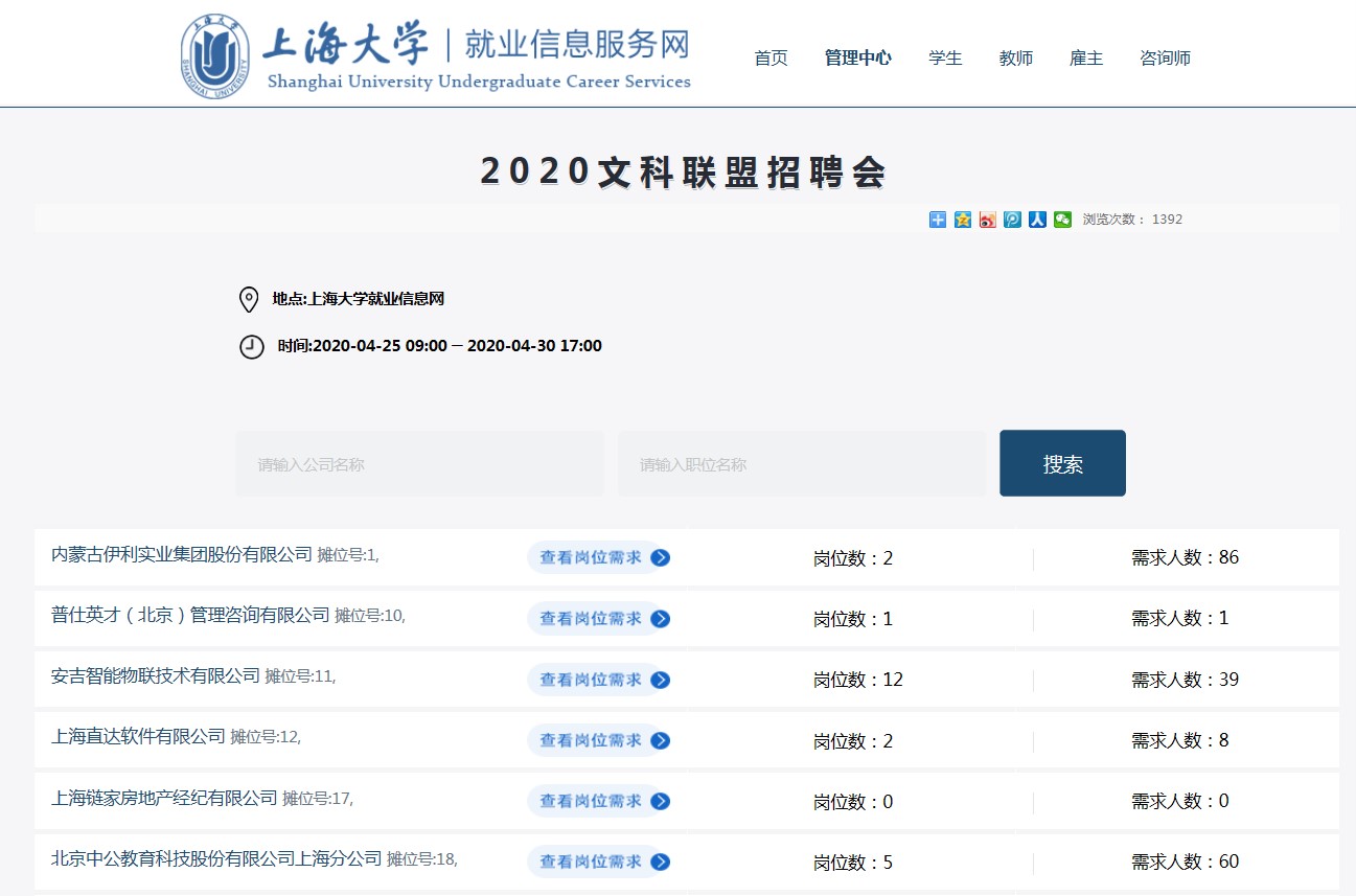 为进一步做好新冠肺炎疫情的防控工作,认真贯彻落实国务院、教育部和上海市的统一部署和要求,促进老员工顺利就业,2020年文科联盟实习就业专场招聘会在2020年4月25日-30日通过网络招聘会形式如期举行,本次招聘会由304永利集团牵头,联合文公司、社会公司、社科学部(筹)共同举办。