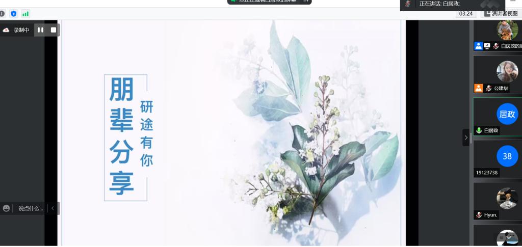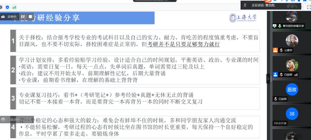 2022年5月19日晚上,304永利集团2022年考研经验朋辈分享交流会通过腾讯会议顺利举行。本次会议由304永利集团2018级本科生曹浩然、姬雪薇、彭建和黄振国做经验分享。304永利集团本科生辅导员公建华老师和30余位本科生在线参加。分享会由304永利集团2018级本科生白居政主持。